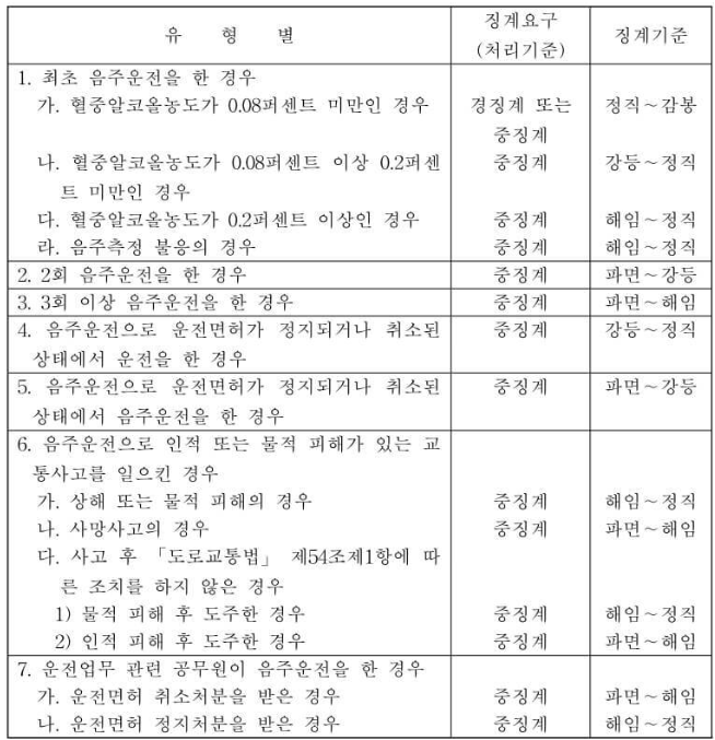- 혈중 알콜 농도 0.2 이상 또는 음주운전 측정 거부 : 해임에서 정직