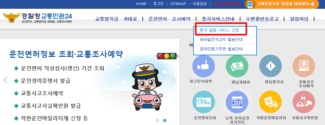해당 문자 알림서비스는 경찰정 교통민원24에서 신청 및 확인 할수 있습니다. 해당 사이트에 들어가서 보면 아래 사진과 같이 나오는데 빨간 네모를 친 문자알림서비스 신청을 하면, 신호위반 속도위반 카메라에 적발시 문자 알림 서비스가 가게 됩니다.