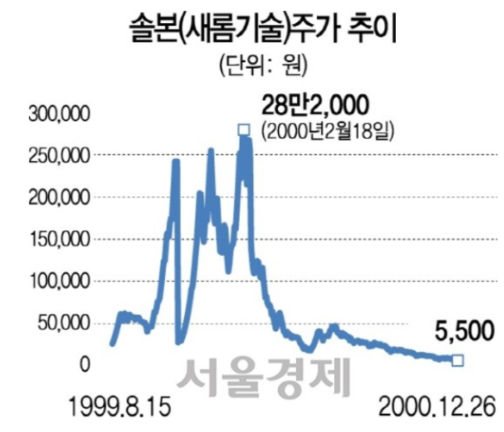 그렇게 상승을 하다가 28만원 주식이 드라마와 같이 5500원으로 마무리 되면서 많은 사람들이 눈물을 흘렸습니다. 그리고 이 새롬기술은 아직도 존재하며, 2003년에 솔본 이라는 업체에 인수되어 아직까지도 존재 합니다.