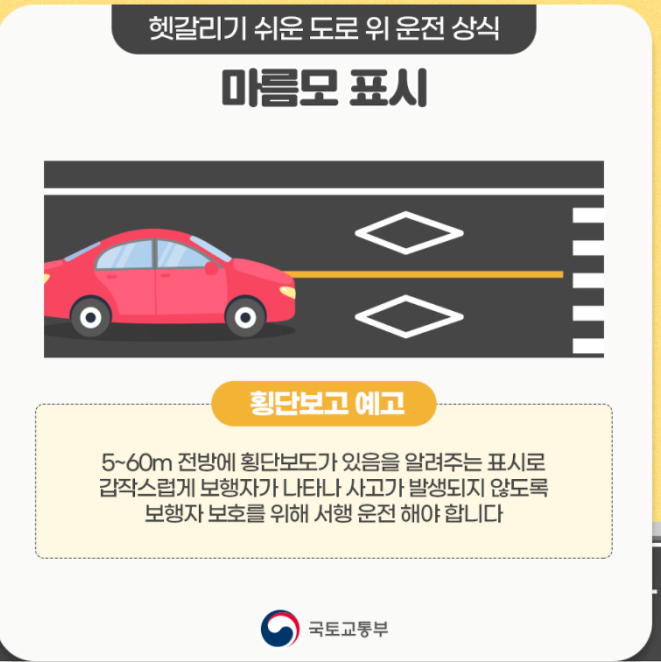 위에 사진과 같이 마름모 표시는 횡단보도 예고 표시 입니다. 전방에 50~60m 를 가면 횡단보도가 있다는 표시 입니다. 횡단보도 근처로 가면 신호 바뀜과 무단횡단등 신경써야 할 것이 많아 지므로, 운전을 할 때 먼저 주의를 기울이고 있고 천천히 가라 이런 뜻으로 보면 되겠습니다.