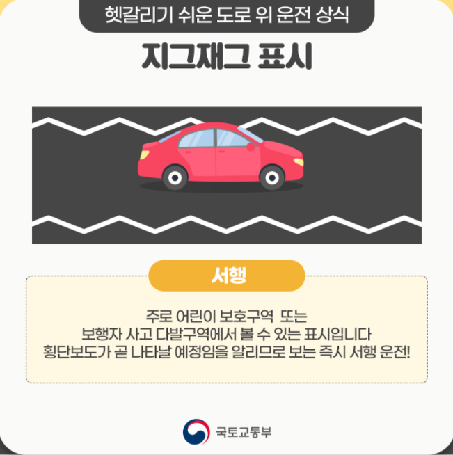그리고 길을 가다보면 지그재그 표시도 볼수 있습니다. 이 지그재그 표시의 뜻은 그림과 같습니다.