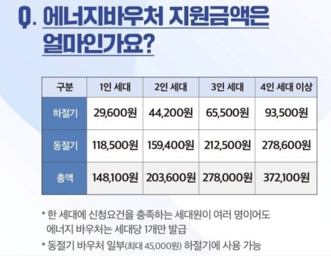 세대원수에 따라서 금액이 달라지며, 세대당 1개만 발급되고 금액은 아래 사진을 참조하시면 됩니다. 동절기 하절기 금액이 정해져 있지만 땡겨서 쓸수 있습니다.