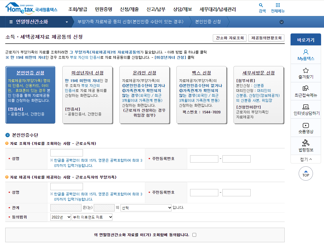 위에 버튼을 누르면 위의 사진과 동일한 창이 뜹니다. 거기서 본인인증과 자료제공자 부양가족을 등록 입력하고 연말정산 조회 동의를 클릭하면 끝입니다.