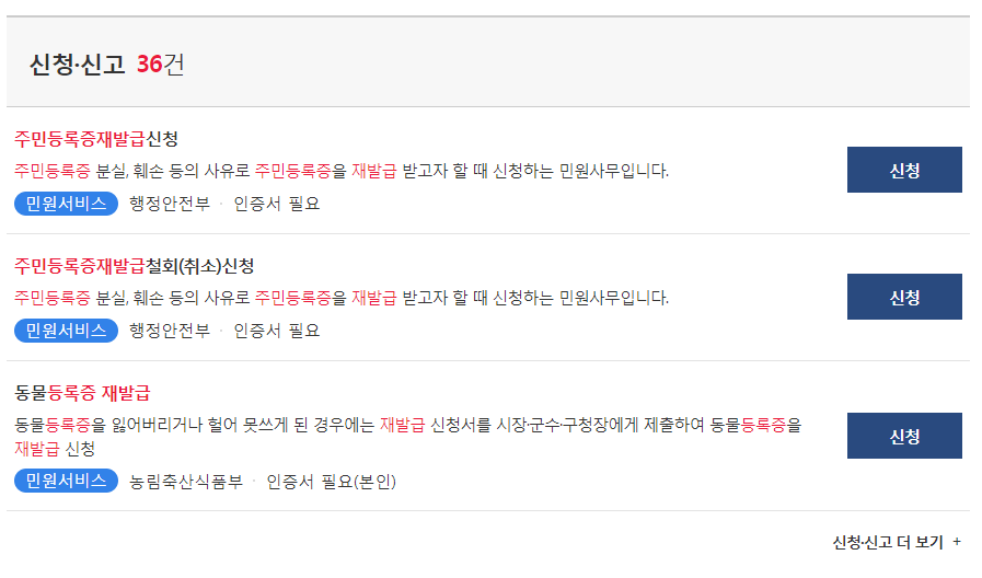- 신청 신고 에 주민등록증재발급신청에서 신청을 클릭합니다.