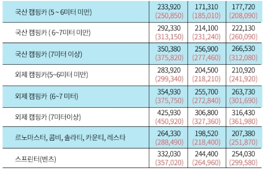 외제차는 차종이 너무 많아서 이 블로글에는 다 못 퍼왔습니다. 캠핑카는 또 아래와 같습니다. 미터당으로 가격이 달라집니다.