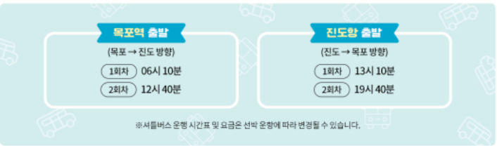 반려동물 탑승도 가능하지만 케이지에 안에 넣어서 탑승하고, 배 안에서 풀어놓으면 안됩니다. 그리고 셔틀버스도 진도 목포 로 운영하기 때문에 ktx 타고 와서 배를 타고 갈수도 있습니다. 셔틀버스 비용은 1인 10,000원 하루 2회 운영합니다.
