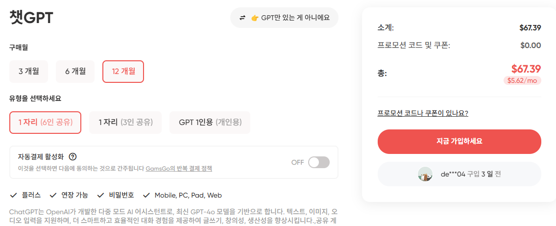 저는 Gamsgo에서 GPT Plus 요금제를 구매해서 3개월 사용 중인데요,