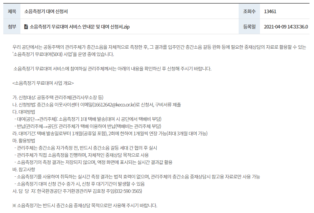 위에 말한 층간소음 이웃사이센터에서 층간소음 측정기도 대여할수 있습니다. 아래에 공지에서 보시다 시피 대여신청서를 다운받아 작성한뒤 아래의 이메일 주소 16612642@keco.or.kr 로 구비서류를 제출하면 됩니다.